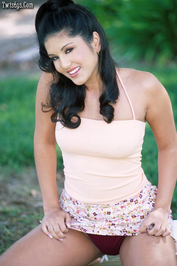 Foxy brunette gal Sunny Leone strips her summer dress and shows her body otudoors.