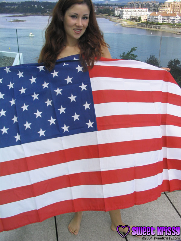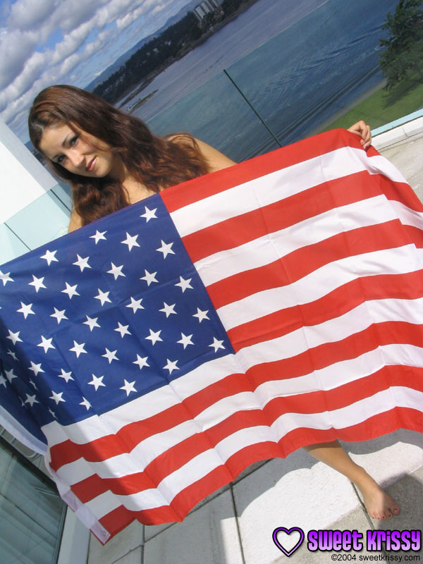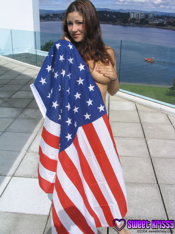 Hot American babhe Sweet Krissy poses outdoors wearing on just an USA flag.
