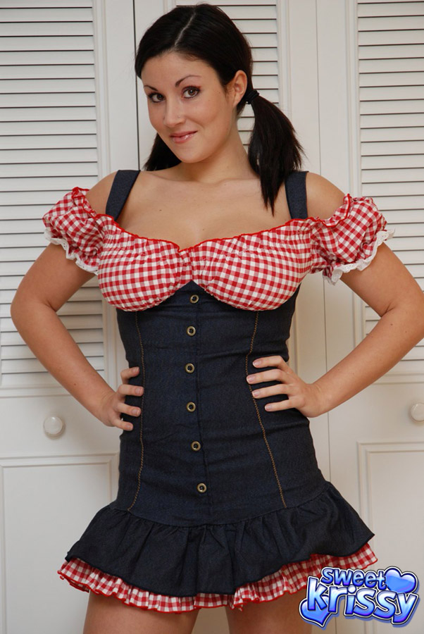 Pigtailed brunette babe Sweet Krissy takes off her dress and shows us her tight ass.