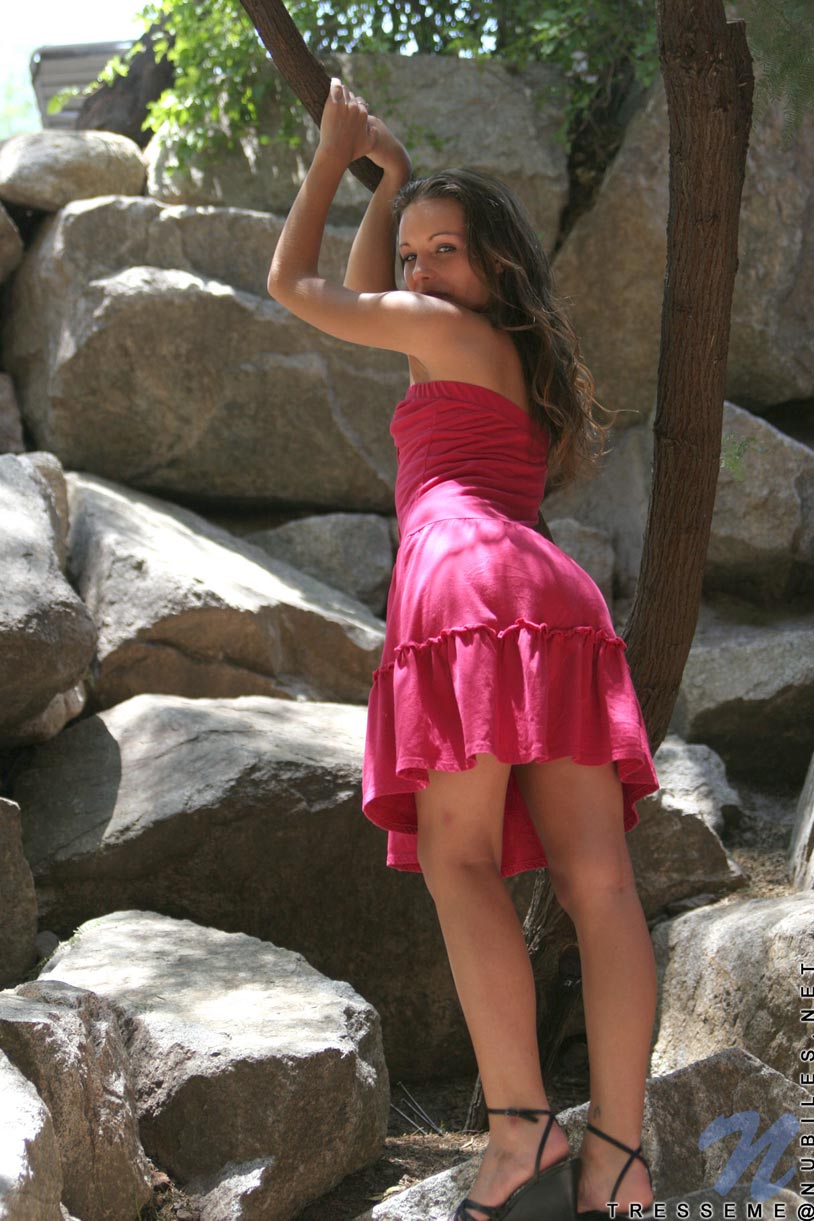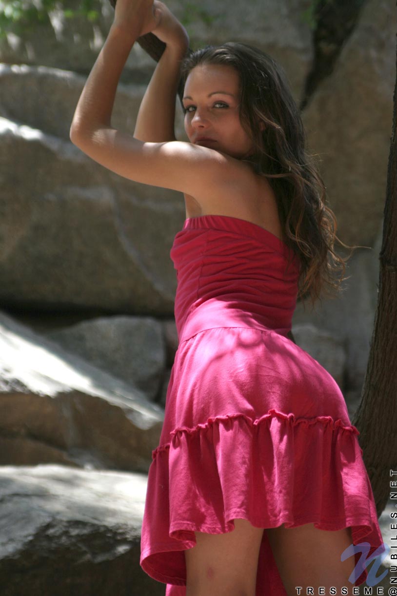 Tresseme Nubiles takes her sexy pink dress outdoors and shows us her fresh muff.