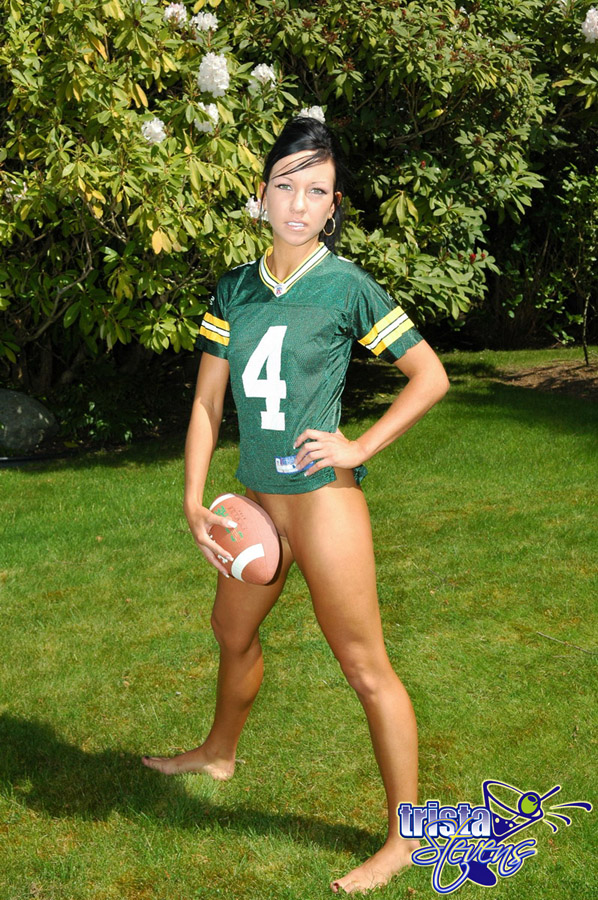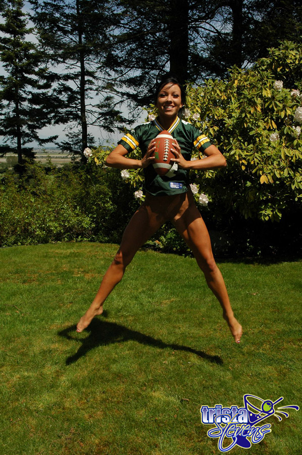 Tanned cutie, Trista Stevens, plays football and masturbates at once outdoors.
