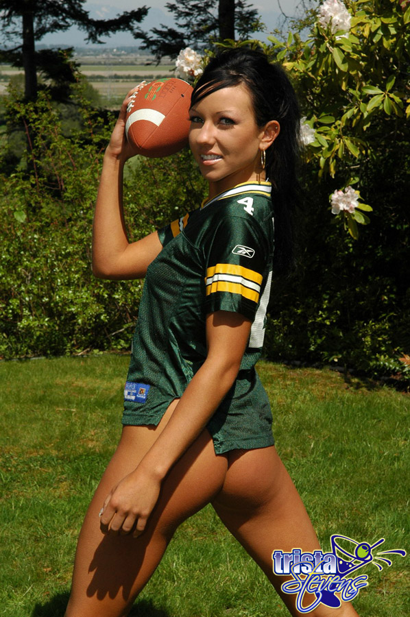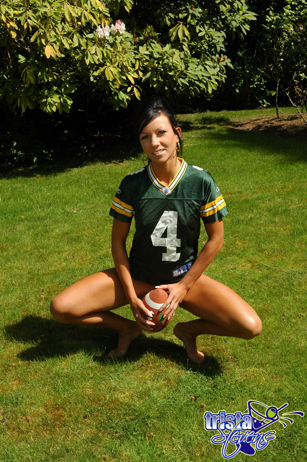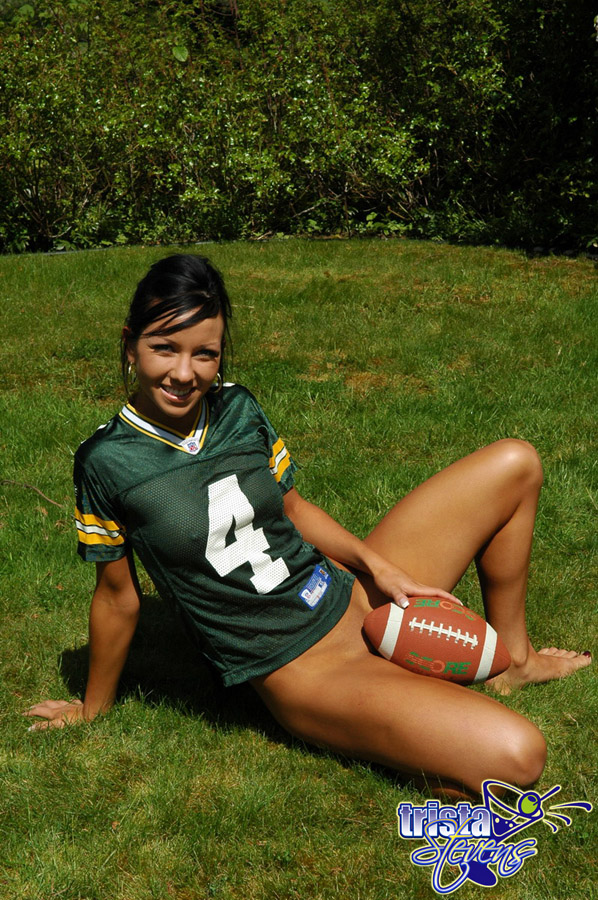 Sporty and naughty Trista Stevens plays naked football on soft and green grass.