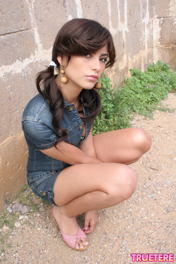 Pigtailed teen cuttie True Tere takes off her denim outfit and shows her hot ass.