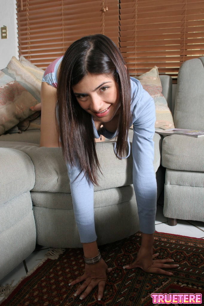 Hot and seductive brunette bunny True Tere takes off her pink panties and shows off.