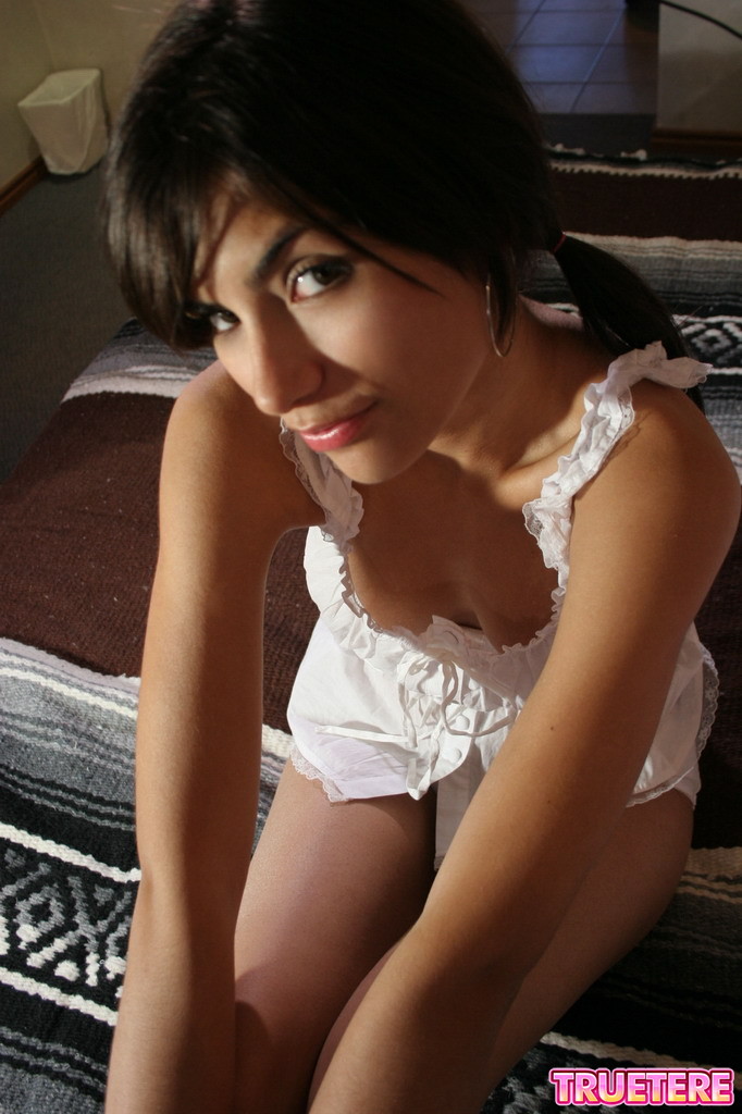 Cute pigtailed brunette True Tere takes off her white lingerie and shows us her ass.