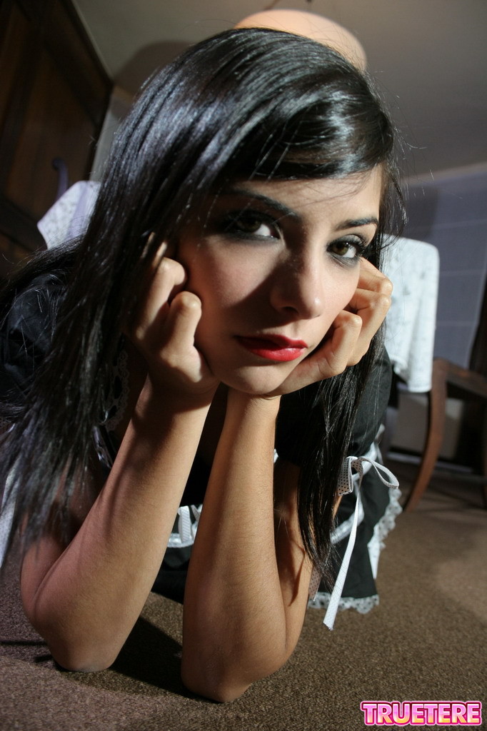 Kinky brunette maid True Tere teases us wearing her slutty uniform and stockings.