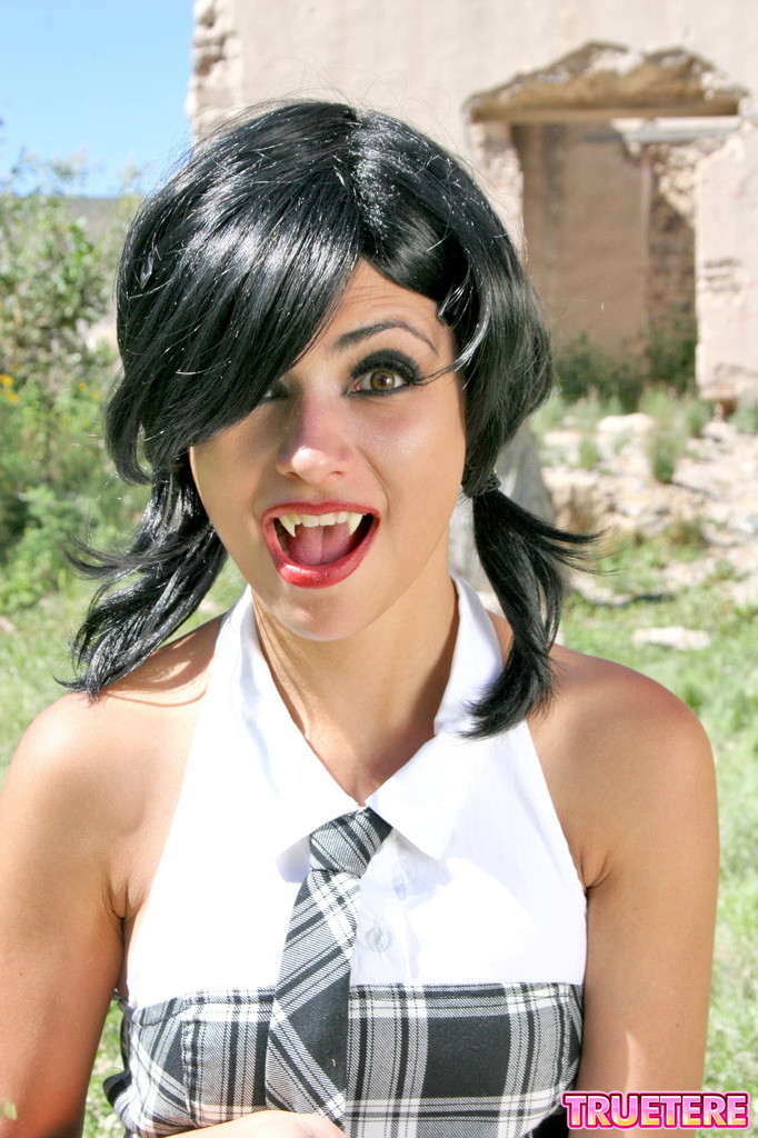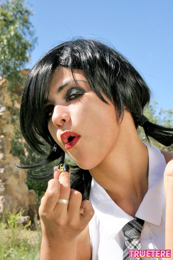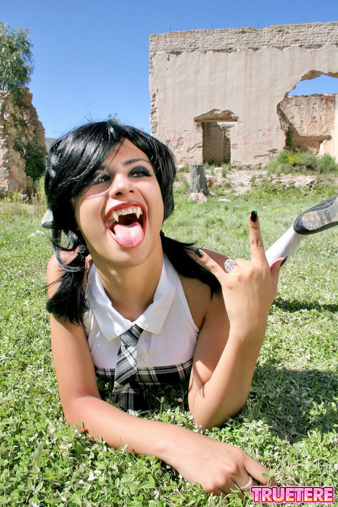 Attractive slutty schoolgirl True Tere strips outdoors and shows her hot body.