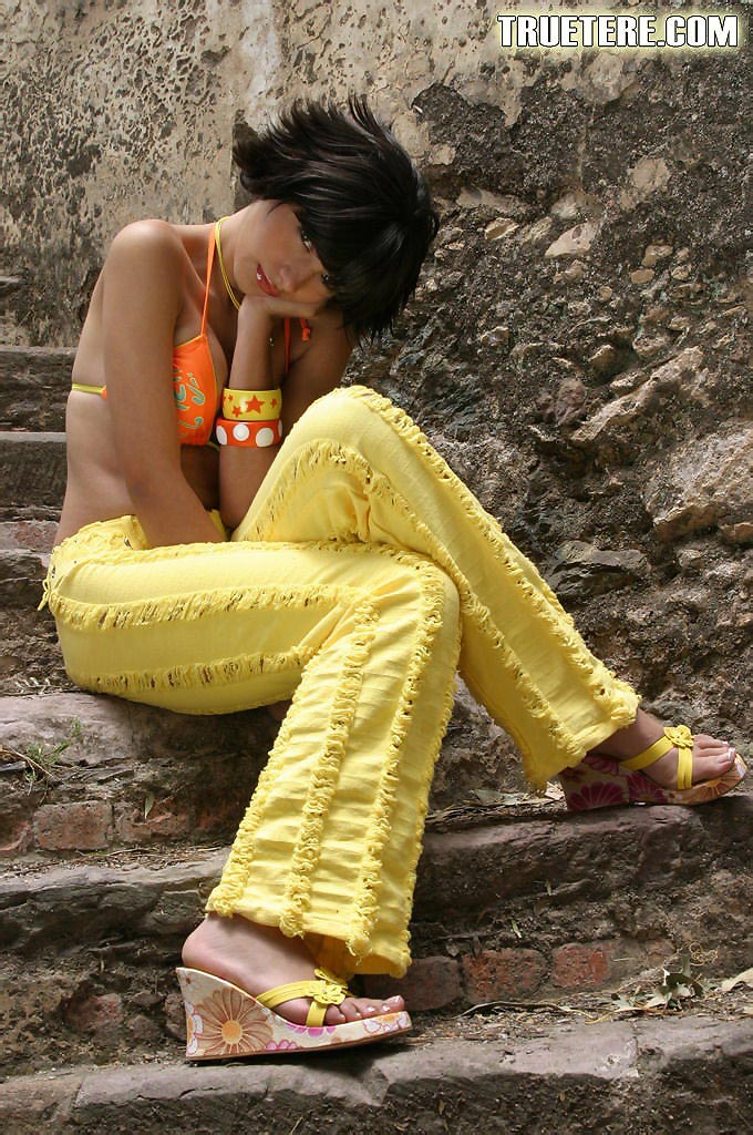Horny short hairred teen True Tere takes off her yellow pants and shows her boobs.