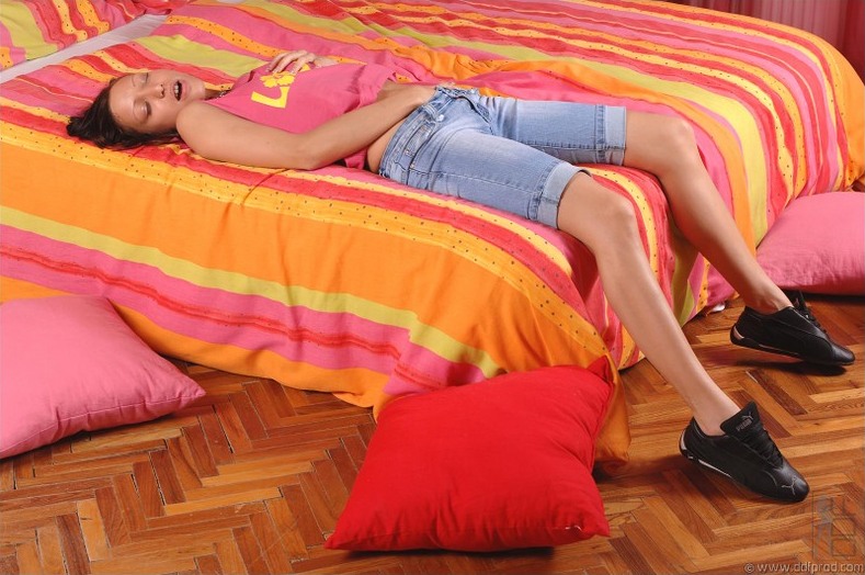 Cute teen gal Victoria Dark strips on her bed and shows her amazing piece of ass.